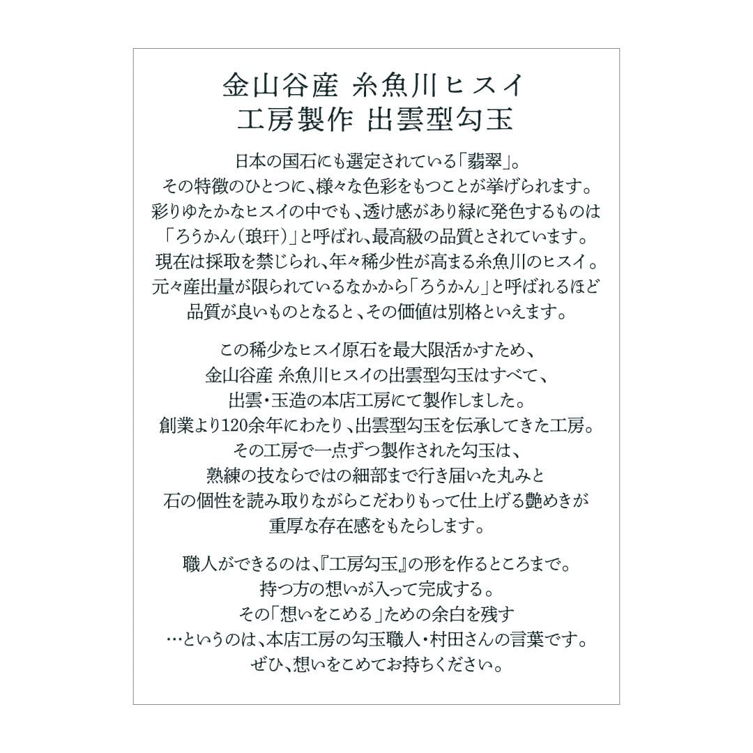 【限定】31ミリ/金山谷産糸魚川翡翠 工房製作 出雲型勾玉【宝石鑑別書付】
