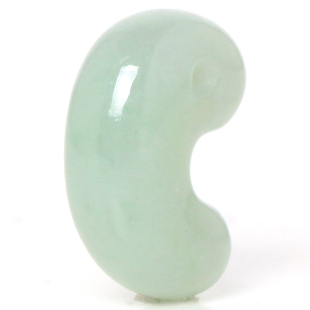 淡く透き通る緑が美しい一品です。色味も均一で、素晴らしい艶やかさを持っています。光に透かすと内包物がほとんど見られず、とびきりの透明感を魅せてくれます。勾玉の穴横付近に薄めのクラックが見られますが、表面はなめらかで美しいです。